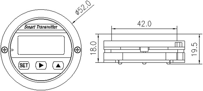 4.4菜單說明 本儀表菜單分為“生產(chǎn)調(diào)試菜單”;“普通用戶菜單”兩級,由各級菜單的進入密碼做為區(qū)分。 ?“生產(chǎn)調(diào)試菜單” 進入密碼為“0066”,由變送器生產(chǎn)廠家使用,對變送器的基本參數(shù)進行設置,決定了變送器的精度,標定值等參數(shù),因此生產(chǎn)調(diào)試菜單不能對一般用戶開放,以免標定數(shù)據(jù)被破壞。 ?“用戶菜單” 進入密碼為“00016”,是針對變送器現(xiàn)場使用要求進行一些特殊設置時使用。 注:在用戶菜單設定時,若30秒內(nèi)無任何按鍵操作,將自動退出設定并返回到測量模式。 4.4.1密碼設定菜單 Lock: 密碼輸入菜單,可設范圍(-1999~9999) 4.4.2工廠調(diào)試菜單 -Sn-:輸入信號放大倍數(shù)設定,可設范圍(1,2,4,8,16,32,64,128,256) 由于市場上的傳感器類型較多,其靈敏度不一致??梢酝ㄟ^面板按鍵調(diào)整放大倍數(shù),具體參考標準為傳感器在滿度狀態(tài)下查看Ad-H菜單的值,此值的絕對值一般在10000~30000之間是合理的。超出此范圍需要調(diào)整放大倍數(shù)。一般擴散硅設置為16,陶瓷設置為128即可。 Ad-L: 零位采集 設定此菜單時需要給變送器施加“dP-L”菜單設定的壓力,按下“SET”鍵時顯示表頭內(nèi)部保存的采集值,此時按下“?”或“▲”時開始采集本次采集,待數(shù)據(jù)穩(wěn)定后再次按下“SET”鍵確認本次采集。 注意:如果采集值大于0x7000時,需要在“-Sn-”菜單中減小放大倍數(shù), 給用戶使用時留出一定的上限余量避免溢出。 Ad-H: 滿位校正點 設定此菜單時需要給變送器施加“dP-H”菜單設定的壓力,按下“SET”鍵時顯示表頭內(nèi)部保存的采集值,此時按下“?” 或“▲”時開始采集本次采集,待數(shù)據(jù)穩(wěn)定后再次按下“SET”鍵確認本次采集。 注意:如果采集值大于0x7000時,需要在“-Sn-”菜單中減小放大倍數(shù), 給用戶使用時留出一定的上限余量避免溢出。 So-L: 零點電流設定 此菜單為變送器量程零位時的電流輸出值,需要在變送器供電回路中串接高精度電流表,按壓“?”或“▲”鍵修改設置,將電流調(diào)至標準4mA或用戶要求的電流值,按壓“SET” 鍵確認。 So-H:滿點電流設定,可設范圍(3.900mA~21.000mA) 此菜單為變送器量程零位時的電流輸出值,需要在變送器供電回路中串接高精度電流表,按壓“?”或“▲”鍵修改設置,將電流調(diào)至標準20mA或用戶要求的電流值,按壓“SET” 鍵確認。 -dP-: 顯示精度設置,可設范圍(0~3) 顯示分辨率即測量模式時顯示的小數(shù)位數(shù),用戶可根據(jù)現(xiàn)場使用要求對其設定,顯示小數(shù)位數(shù)并非越多越好,應優(yōu)先保證顯示值的穩(wěn)定。 dP-L:標定量程下限設定,可設范圍(-1999~9999) 此設定值對應生產(chǎn)時所加的零位壓力值。 dP-H: 標定量程上限設定,可設范圍(-1999~9999) 此設定值對應生產(chǎn)時所加的滿點壓力值。 LInE:中點線性修正設定 給變送器施加量程中點壓力,查看變送器實際電流輸出,變送器中點理論電流值減去實測電流值的差值即為線性修正值,注意有正負的區(qū)分。 注意:為了保證變送器中點電流輸出的準確性,本款表頭中點修正時以電流值為參考計算線性修正值,而不是以顯示來計算。 ZErO: 零滿屏蔽系數(shù),可設范圍(0.00~1.00) 此菜單設定值表示零滿屏蔽范圍,設定值為“0.0”時為關(guān)閉零滿屏蔽功能。舉例:設定為0.10時表示當變送器輸出接近零點或滿點加減變送量程的0.10%時,變送器輸出會自動穩(wěn)定在零點或滿點上,不會出現(xiàn)因干擾而輸出跳動現(xiàn)象。 bS-L: 變送量程下限設定,可設范圍(-1999~9999) 此功能可實現(xiàn)變送輸出的零點無源遷移,其設定的壓力值將對應到“So-L”零點電流菜單設定電流值,為了方便用戶設定,變送器的變送最小量程可按傳感器量程的3:1進行壓縮,最大量程可按傳感器量程的1:1進行設置,超出此范圍將影響變送輸出精度。 bS-H: 變送量程上限設定,可設范圍(-1999~9999) 此功能可實現(xiàn)變送輸出的滿點無源遷移,其設定的壓力值將對應到“So-H”滿點電流菜單設定電流值,變送器的變送最小量程可按傳感器量程的3:1進行壓縮,最大量程可按傳感器量程的1:1進行設置。超出此范圍將影響變送輸出精度。 End: 退出設定菜單 在此菜單下按“SET”鍵,退出設置模式,并保存設置數(shù)據(jù)。 4.4.3普通用戶菜單 bS-L: 變送量程下限設定,可設范圍(-1999~9999) 此功能可實現(xiàn)變送輸出的零點無源遷移,其設定的壓力值將對應到“So-L”零點電流菜單設定電流值,為了方便用戶設定,變送器的變送最小量程可按傳感器量程的3:1進行壓縮,最大量程可按傳感器量程的1:1進行設置,超出此范圍將影響變送輸出精度。 bS-H: 變送量程上限設定,可設范圍(-1999~9999) 此功能可實現(xiàn)變送輸出的滿點無源遷移,其設定的壓力值將對應到“So-H”滿點電流菜單設定電流值,變送器的變送最小量程可按傳感器量程的3:1進行壓縮,最大量程可按傳感器量程的1:1進行設置。超出此范圍將影響變送輸出精度。 oFSt: 顯示偏移值,可設范圍(-19999~99999) 通過對此菜單值的設定,可以對變送器顯示與輸出值進行偏移,此菜單出廠默認值為0,一般情況下無需對此菜單值進行設定。 FiLt: 濾波常數(shù)設定,可設范圍(0~4) 濾波常數(shù)值設定越大,對干擾的抑制能力越強,但靈敏度會下降,生產(chǎn)標定時本菜單值默認值