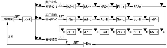 4.1按鍵功能說明 4.1.1設定鍵“SET” ?測量模式下短按為開,進入密碼設置。 ?設置模式菜單顯示時,短按為使能參數(shù)修改,顯示當前菜單對應參數(shù)值,再次短按確認參數(shù)修改,返回菜單顯示狀態(tài)。 4.1.2移位鍵“?” ?測量模式下短按無功能。 ?測量模式下長按5秒執(zhí)行主變量清零功能。 ?設置模式下為移位與減一功能。 4.1.3增加鍵“▲” ?測量模式下短按與長按無功能。 ?設置模式下為加一功能。 ?ADC采集菜單下短按為采集使能。 4.1.4按鍵功能綜述 儀表通過面板的三個按鍵實現(xiàn)所有的參數(shù)輸入和校準數(shù)據(jù)的設置、采集,本儀表的設置和輸入采取了多種優(yōu)化措施來提高客戶的操作速度: ?儀表的移位鍵和增加鍵具有變速率功能。 ?儀表同時具有移位和增量輸入方法,針對需要大量數(shù)修改的菜單使用移位方式,需要連續(xù)輸入數(shù)據(jù)的菜單采取了增量方式。 ?儀表在設置狀態(tài)下會停止模擬輸出,在用戶設置模式下如果30秒內(nèi)用戶沒有操作儀表,則會自動退出到測量狀態(tài)。 ?儀表在正常退出菜單的時候才會保存所有設置的參數(shù)。 4.2主變量清零 ?主變量清零即PV清零,是相對大氣壓下的零點,不是傳感器量程的零點。將變送器直接置于大氣壓下,長按“?”鍵5秒以上,即可進入主變量清零功能。 ?若變送器已經(jīng)執(zhí)行過清零操作,再此執(zhí)行清零操作時將恢復未清零狀態(tài),如需重新清零則需要再執(zhí)行一次清零操作。 ?清零范圍為變送量程的25%,超出此范圍時將不執(zhí)行清零功能。 4.3設置框圖