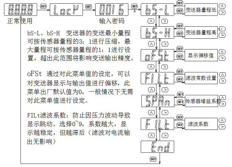 在變送器使用過程中,若傳感器的靈敏度發(fā)生改變時(shí),可通過此菜單對其修正,在進(jìn)行變送器的靈敏度修正前,若變送器零點(diǎn)有誤差,應(yīng)先通過主變量清零功能對變送器的零點(diǎn)誤差進(jìn)行修正,以保證靈敏度修正后變送的線性正常,此菜單默認(rèn)值為“1.0000”,此菜單也可用作液位變送器的密度修正,方便客戶在介質(zhì)密度發(fā)生變化是調(diào)整變送器輸出。